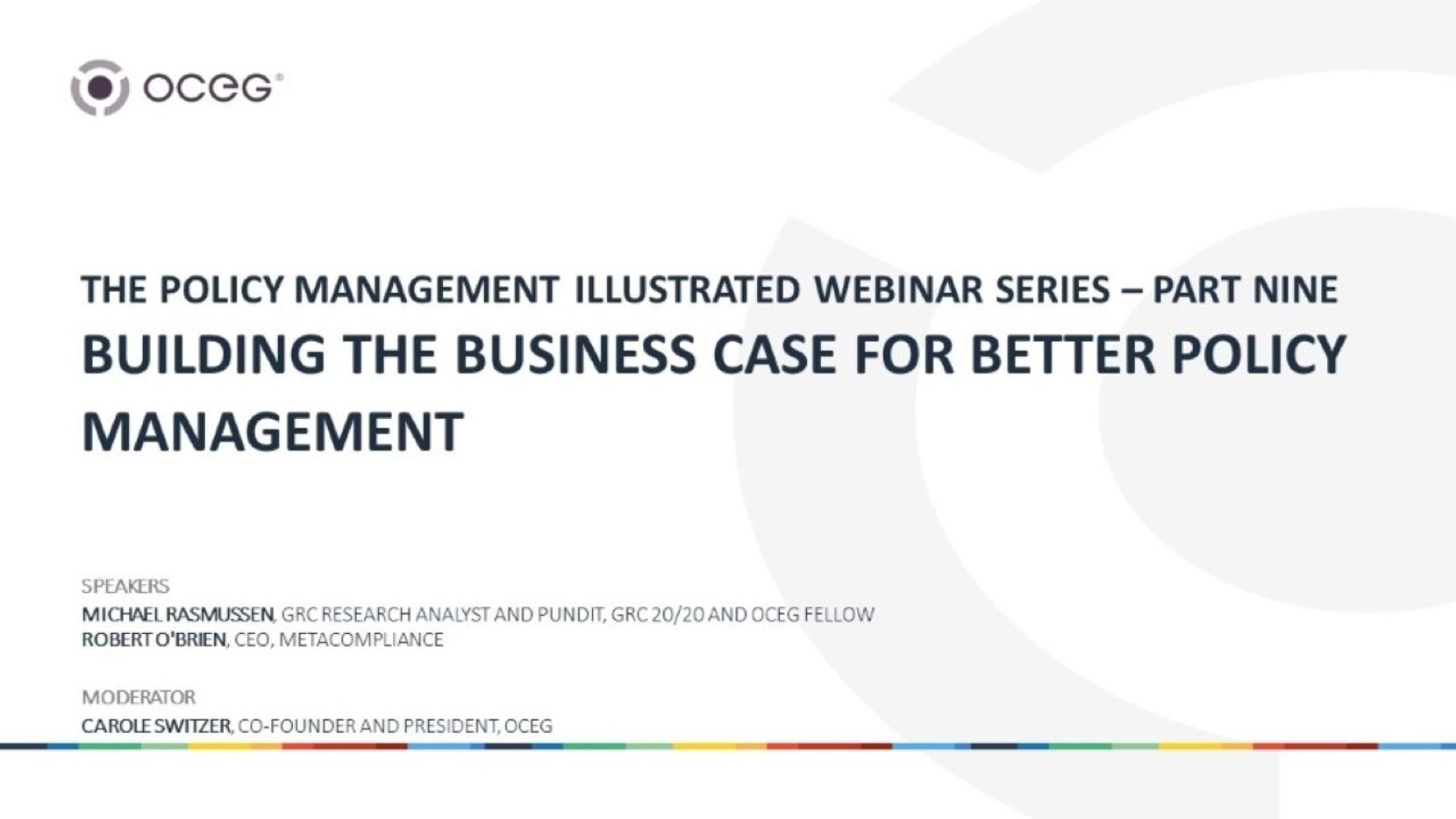 The Policy Management Illustrated Webinar Series – Part Nine. This ninth installment of the Policy Management Illustrated Webinar Series shows you how to develop and pitch a winning business case for improving your organization’s approach to policy management.