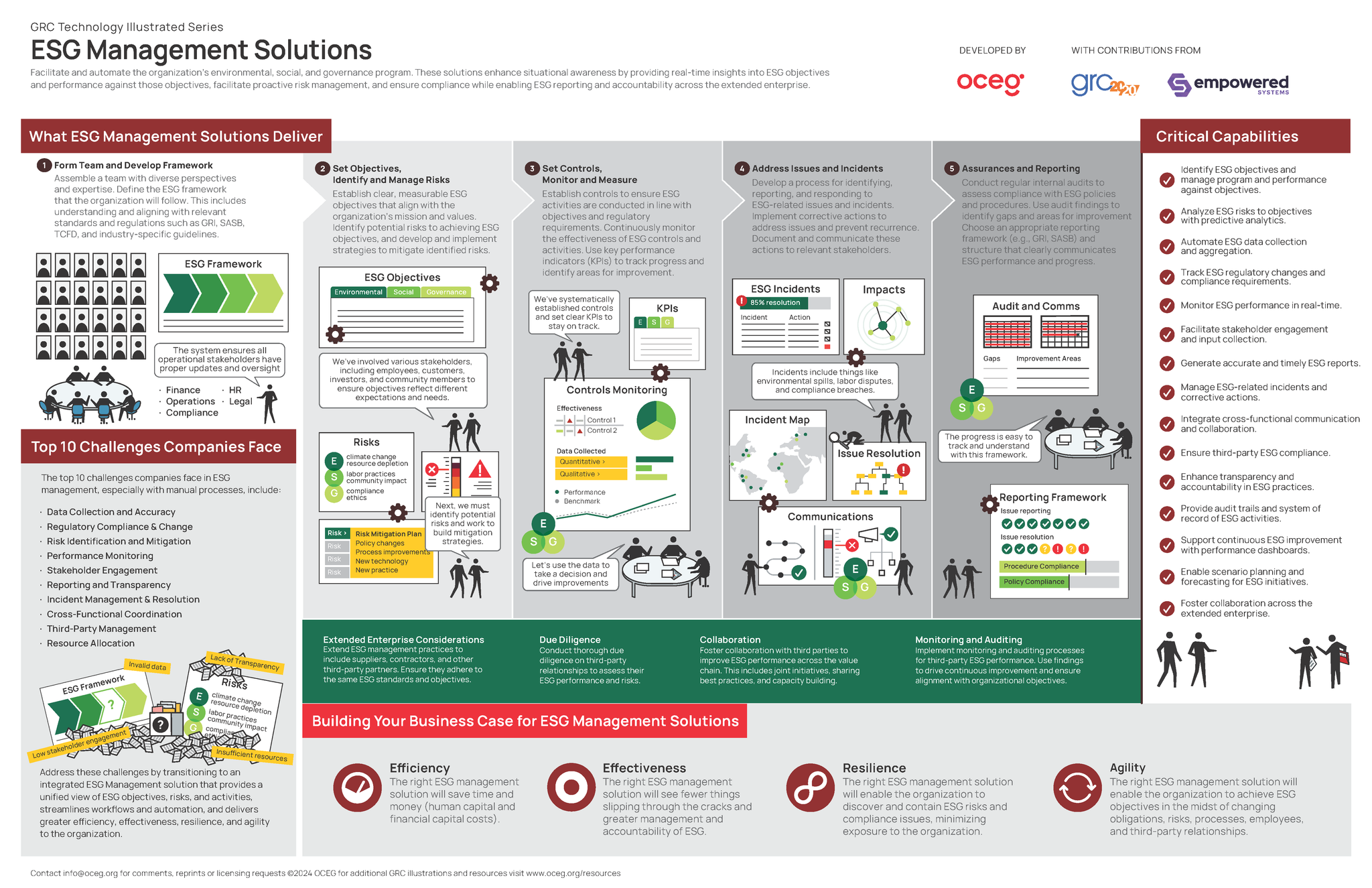 Meaningful ESG management and reporting isn't easy. This installment in the OCEG GRC Technology Illustrated Series describes solutions that: 1. enhance situational awareness by providing real-time insights into ESG objectives and performance against those objectives, 2. facilitate proactive risk management, and 3. ensure compliance while enabling ESG reporting and accountability across the extended enterprise. Use it to streamline ESG efforts and reporting in your organization.