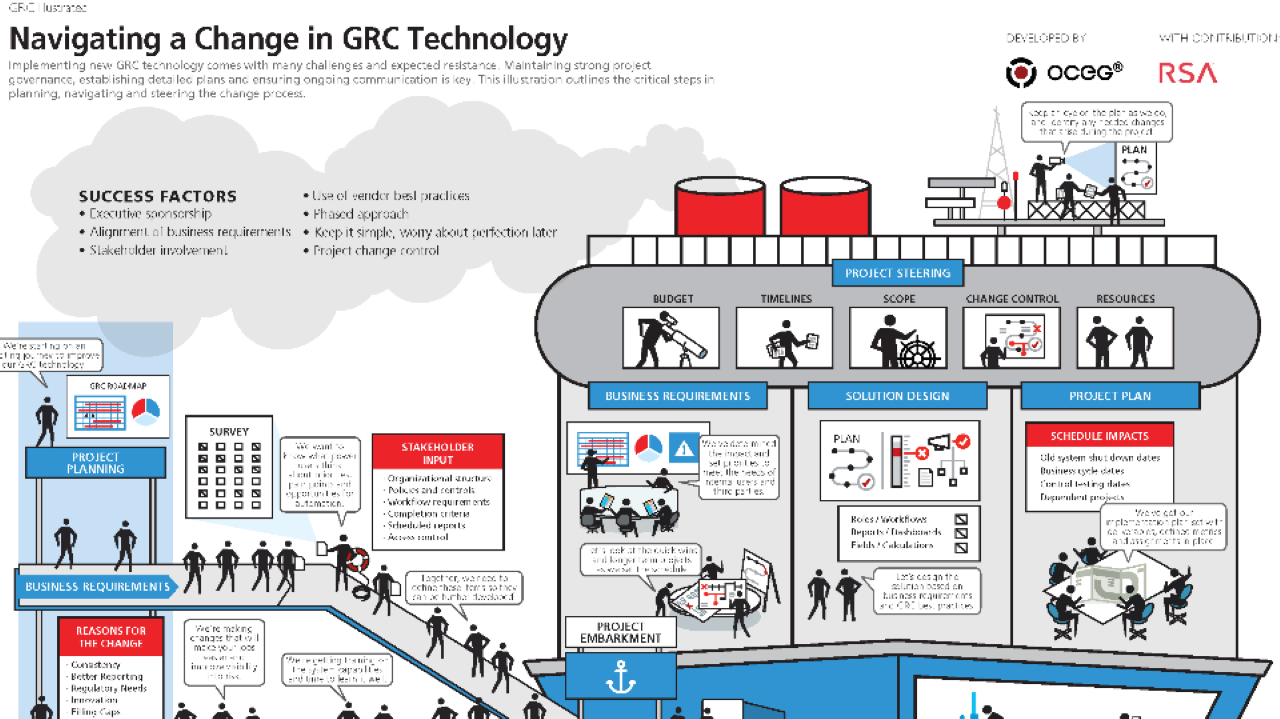 Implementing new GRC technology comes with many challenges and expected resistance. This illustration outlines the critical steps in planning, navigating and steering the change process.