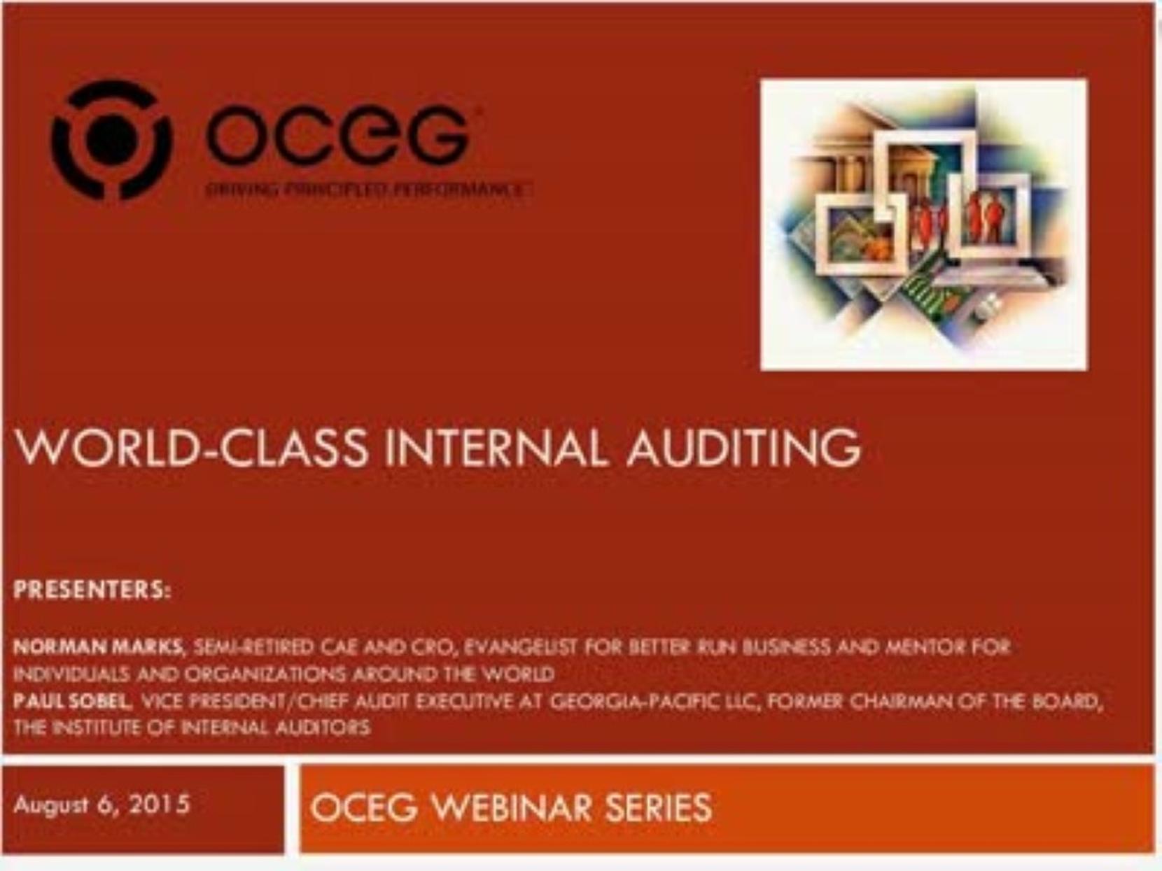 Join Norman Marks and Paul Sobel for a conversation about what it takes to have a world-class internal audit function. Norman Marks, who is not only an OCEG™ Fellow but an Honorary Fellow of the Institute of Risk Management, led the internal audit activity at global corporations for about 20 years; he is the author of World-Class Internal Audit: Tales from my Journey and a new book, World Class Risk Management. Paul is the Vice President/Chief Audit Executive of Georgia-Pacific LLC and a former Chairman of The Institute of Internal Auditors.