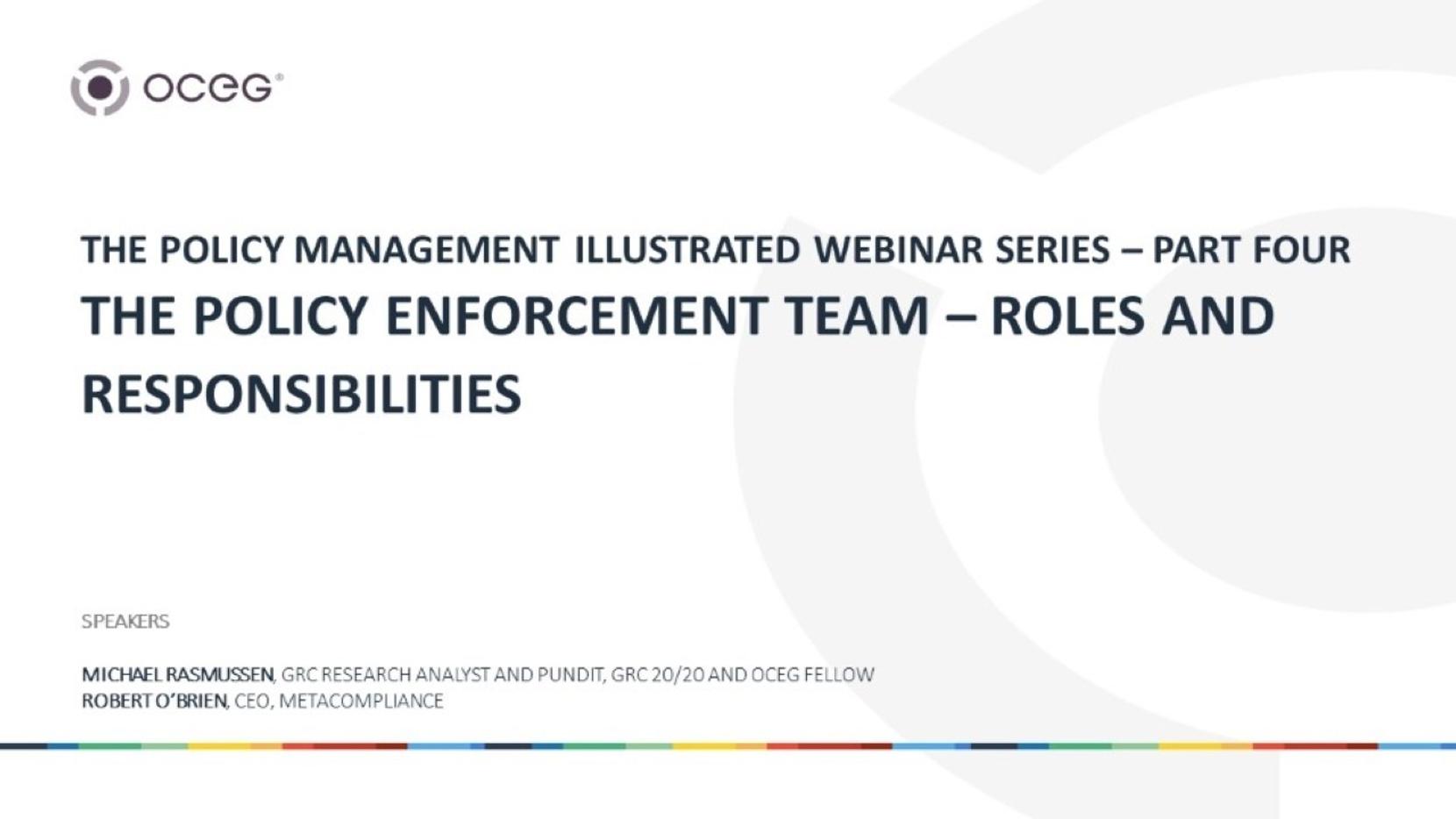 The Policy Management Illustrated Webinar Series – Part Four. This fourth installment of the Policy Management Illustrated Webinar Series examines ways to ensure policies are consistently implemented and enforced and outlines the roles different departments play in the process.